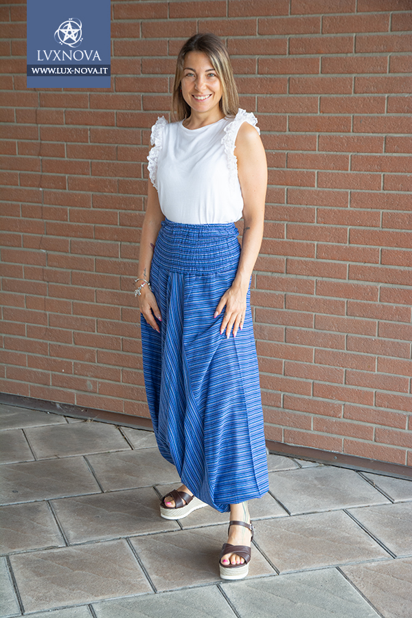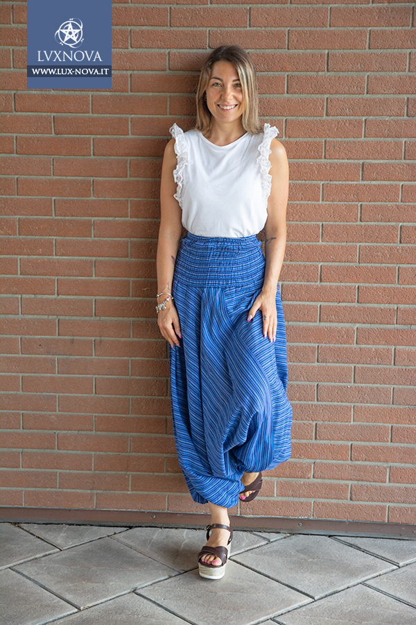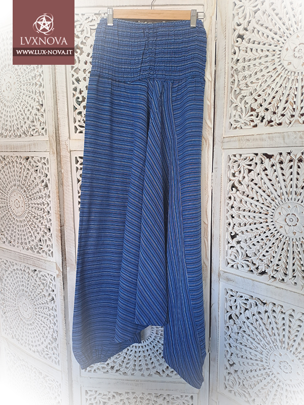 Pantalone afghano in cotone a righe, fascia alta larga elastica in vita e caviglie.