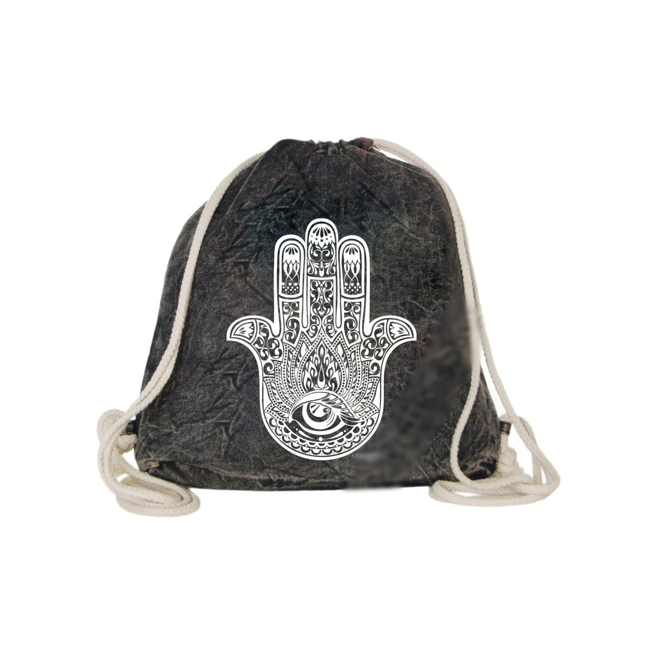 Zaino in cotone, lavorato stone washed con stampa hamsa, foderato.