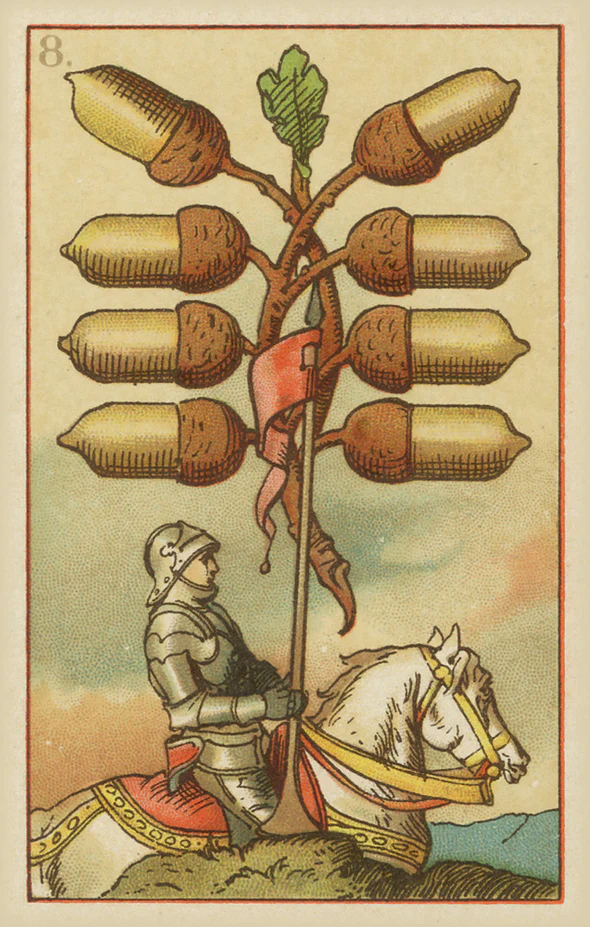 Un antico mazzo di carte da gioco e per la divinazione, illustrato con scene di vita medievale. Ogni seme rappresenta un tema diverso – relazioni amorose, caccia, commercio, guerra – per offrire una vasta gamma di significati ed interpretazioni per la divinazione. È il secondo mazzo della linea di Cartomanzia Antica, originario del Sud della Germania, XVIII secolo.