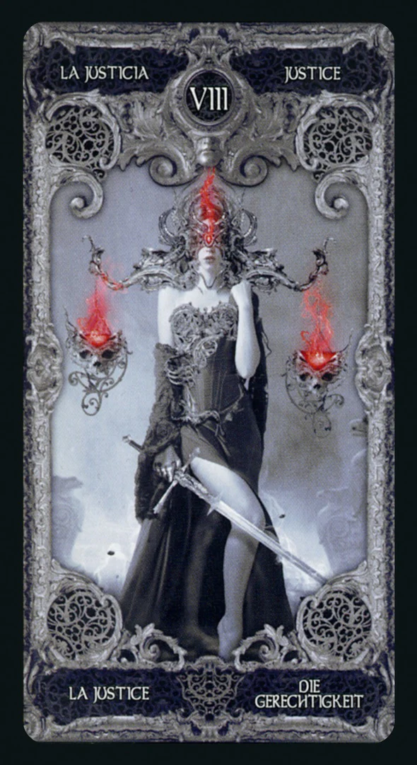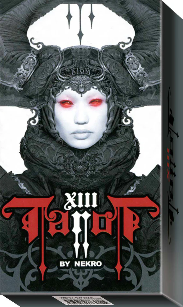 Un mazzo di carte di Tarocchi dal disegno fine ed elaborato e dall’inquietante eleganza, con elementi rosso vivo su toni di grigio e nero.