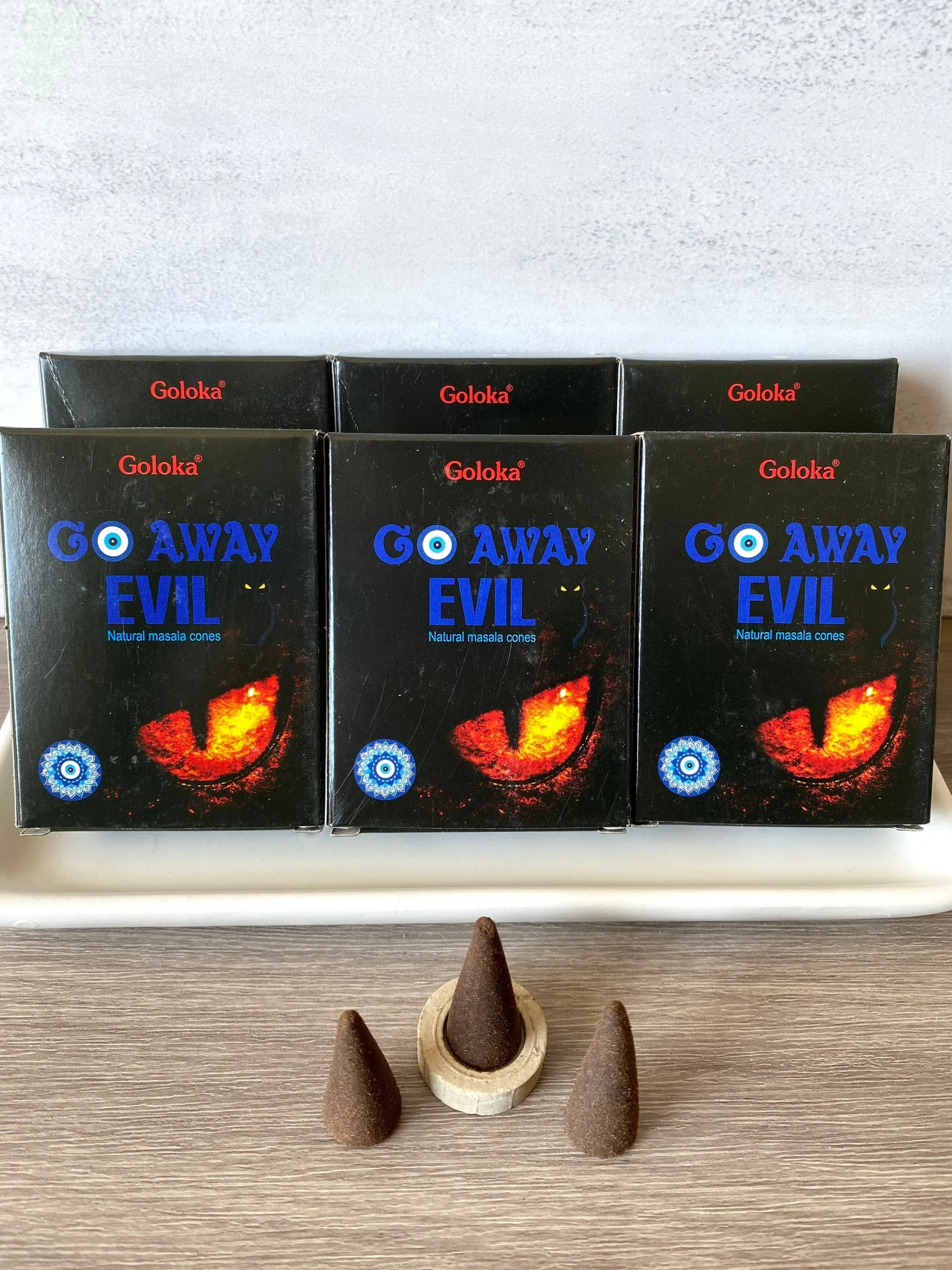 Coni di incenso Goloka – Allontana il male (Go Away Evil) (Incensi a cono). I coni d’incenso Goloka sono prodotti artigianalmente con ingredienti 100% naturali, realizzati con la tecnica Masala, dove gli incensi vengono prodotti artigianalmente come da antica tradizione, miscelando polveri lignee e vegetali come resine, erbe, radici e cortecce, fiori, oli essenziali e miele. Go Away Evil serve per il corpo, per la pulizia della casa e la meditazione.