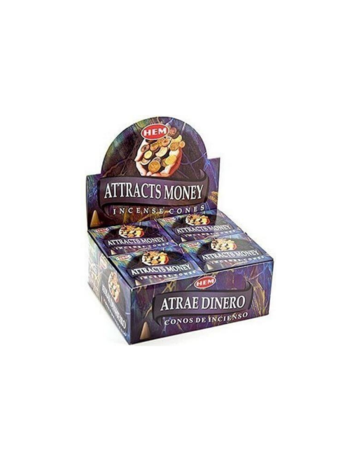 Coni di incenso HEM – Attrai denaro (Incensi a cono). I coni d’incenso Hem sono tradizionalmente fatti a mano e realizzati con una miscela di oli naturali, erbe e resine. La scatola contiene 10 coni e un supporto di metallo su cui possono essere bruciati.