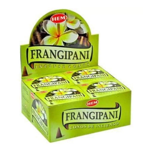 Coni di incenso HEM – Frangipani (Incensi a cono). I coni d’incenso Hem sono tradizionalmente fatti a mano e realizzati con una miscela di oli naturali, erbe e resine. La scatola contiene 10 coni e un supporto di metallo su cui possono essere bruciati.