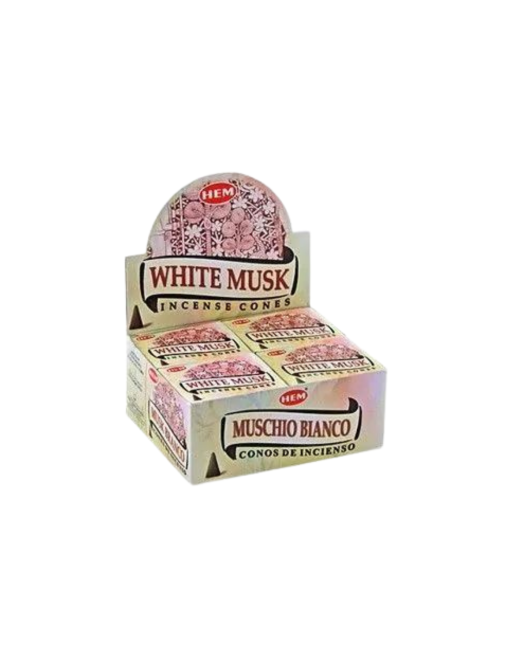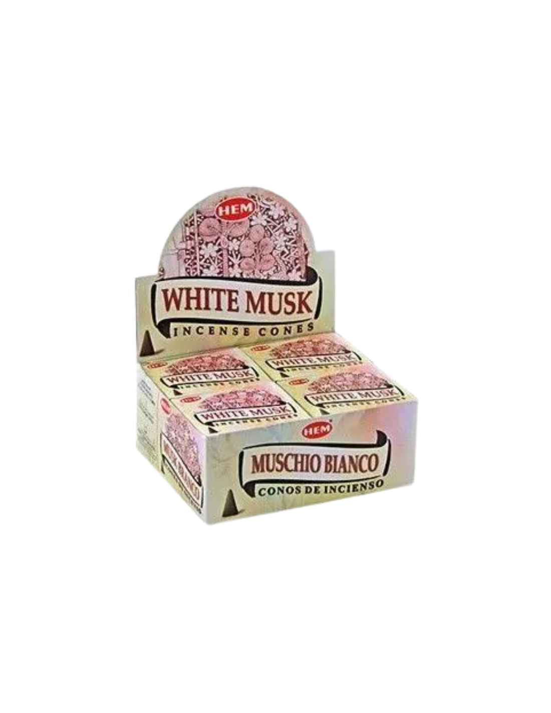 Coni di incenso HEM – Muschio Bianco (Incensi a cono). I coni d’incenso Hem sono tradizionalmente fatti a mano e realizzati con una miscela di oli naturali, erbe e resine. La scatola contiene 10 coni e un supporto di metallo su cui possono essere bruciati.