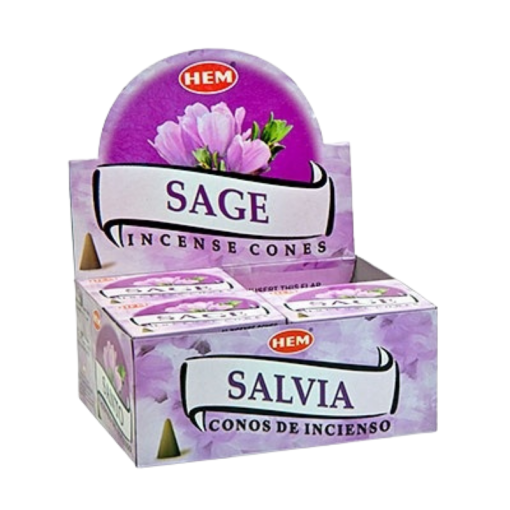 Coni di incenso HEM – Salvia (Incensi a cono). I coni d’incenso Hem sono tradizionalmente fatti a mano e realizzati con una miscela di oli naturali, erbe e resine. La scatola contiene 10 coni e un supporto di metallo su cui possono essere bruciati.