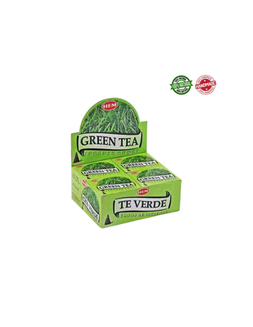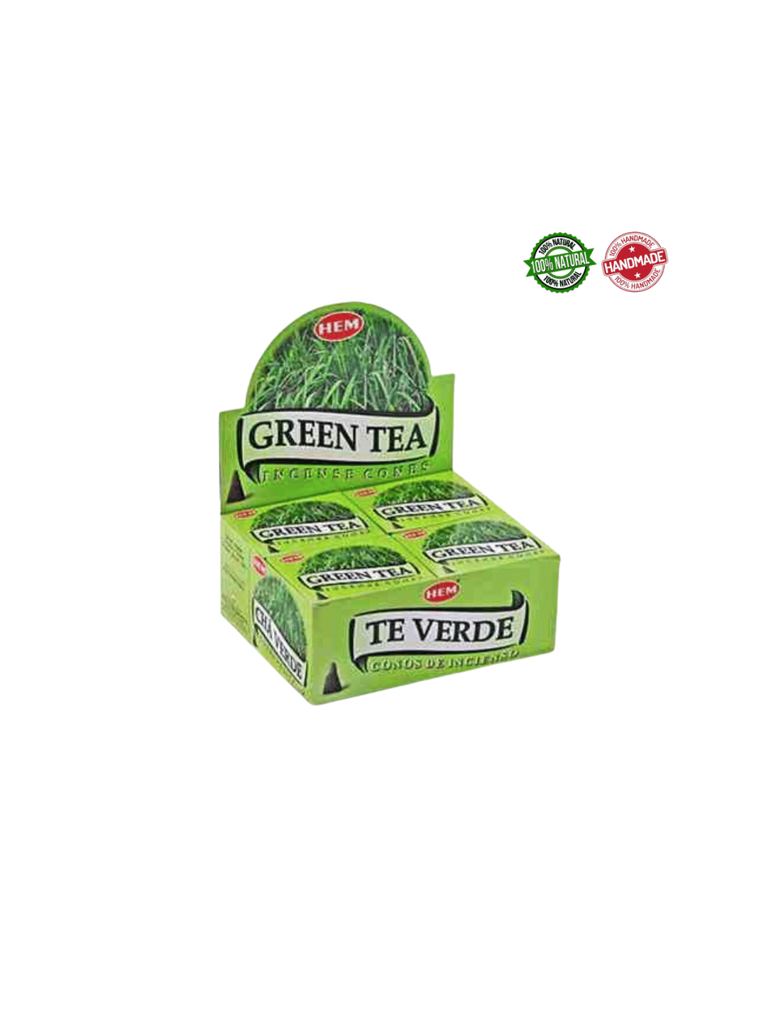 Coni di incenso HEM – Te Verde (Incensi a cono). I coni d’incenso Hem sono tradizionalmente fatti a mano e realizzati con una miscela di oli naturali, erbe e resine. La scatola contiene 10 coni e un supporto di metallo su cui possono essere bruciati.