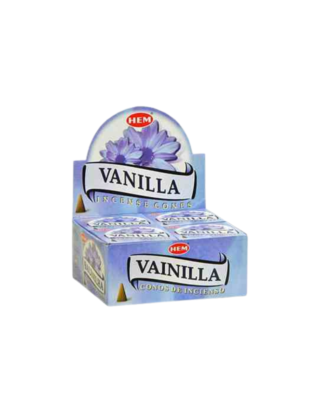 Coni di incenso HEM – Vaniglia (Incensi a cono). I coni d’incenso Hem sono tradizionalmente fatti a mano e realizzati con una miscela di oli naturali, erbe e resine. La scatola contiene 10 coni e un supporto di metallo su cui possono essere bruciati.