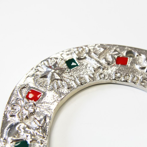 Questo Ferro di Cavallo in Zama con dettagli rossi e verdi è un autentico talismano carico di significato e potere.