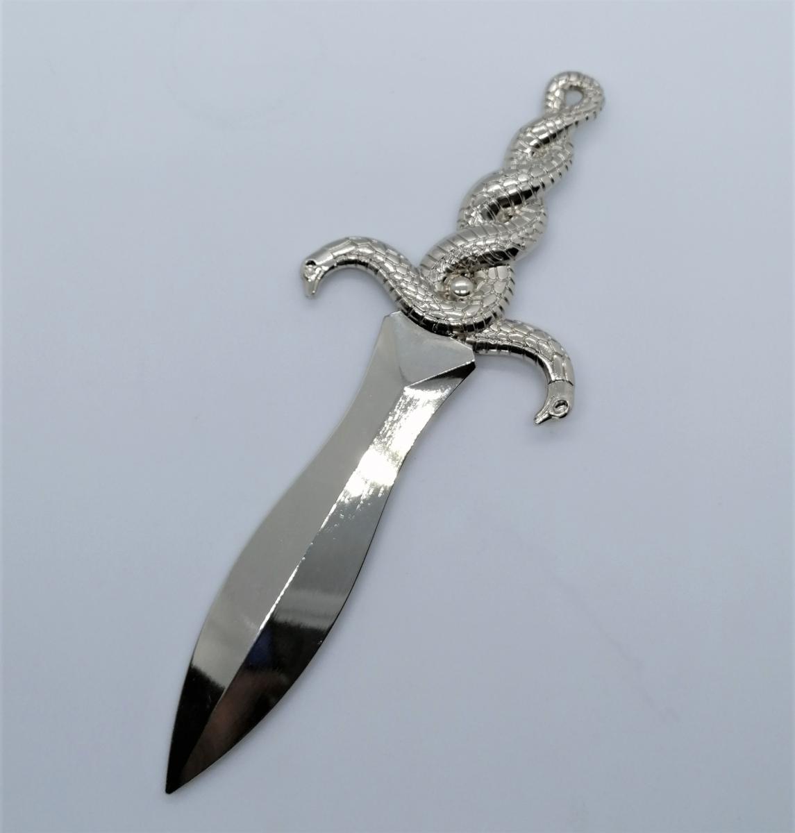 Pugnale con impugnatura a forma di due serpenti, realizzato in zama (lega di zinco).