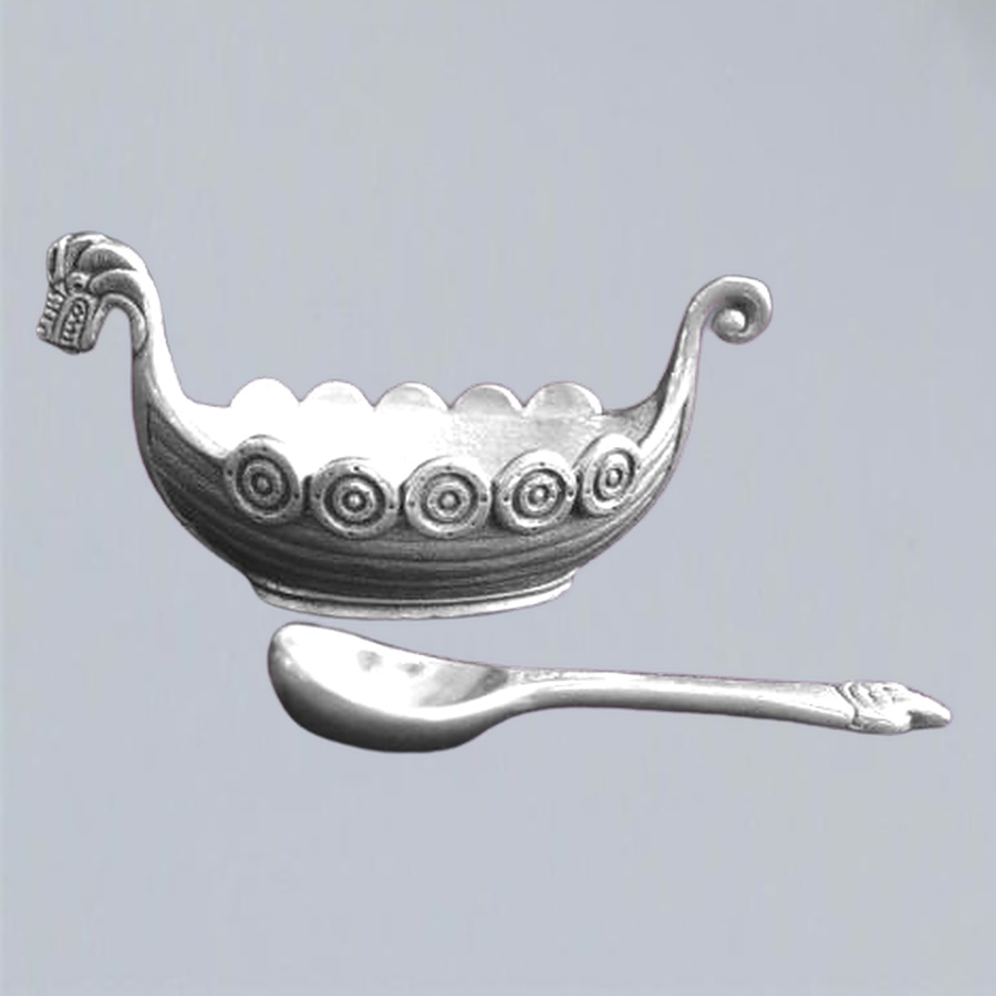 Ciotola per il sale in peltro a forma di barca vichinga con cucchiaio, utilizzabile come ciotola d’altare per il sale o l’incenso.