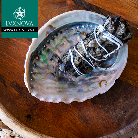 Kit base di purificazione con Yerba Santa (smudge 10 cm. di Eriodictyon californicum) e conchiglia di abalone. (circa 16 x 13 x 3,5 cm. 250 gr.)