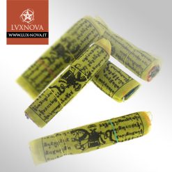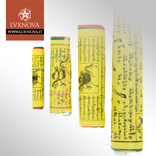 Le bandiere di preghiera tibetane, note anche come lung-ta (“cavalli del vento”), non servono per chiedere favori agli dèi ma per diffondere benedizioni e vibrazioni positive attraverso il vento. Appendendole in un luogo con passaggio d’aria — sopra una porta, una finestra, un altare o all’esterno — contribuiscono a purificare l’ambiente e a ricordare che ogni gesto porta energia benevola all’intorno.